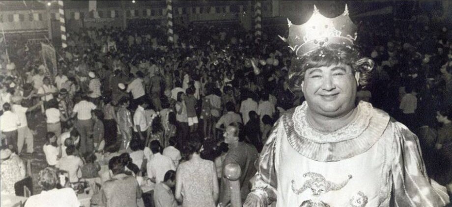 A fotografia mostra Geraldo Júlio, o Dinho, coroado, sorrindo para a câmera enquanto, ao fundo, uma multidão ocupa o salão em clima de Carnaval. A cena é de 1968, no Londrina Country Club. Ele está à frente da festa, mas também faz parte dela.