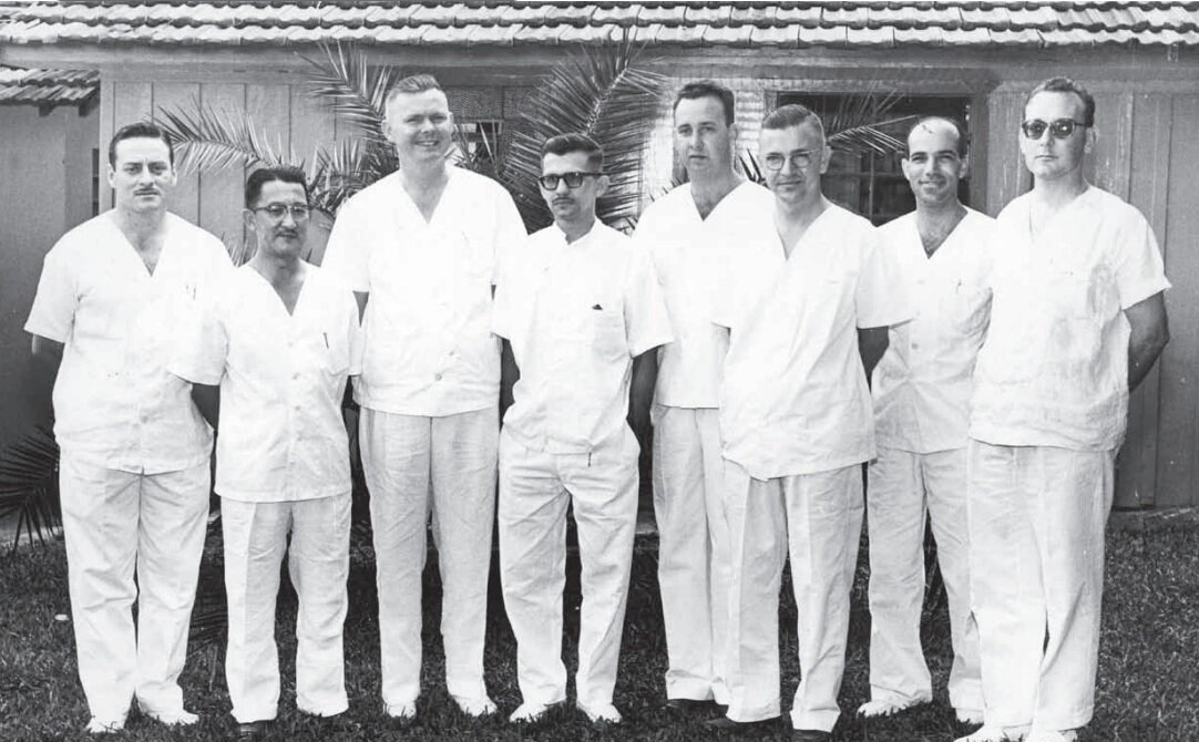 Na foto, o primeiro corpo clínico do Hospital Evangélico, em 1958. Da esquerda para a direita, estão os médicos: Vicente José Lorenzo Isquierdo, Issao Udihara, João Henrique Steff en Junior, Regis Salles Azevedo, Heber Soares Vargas, Vander de Carvalho, Wilson Salles, José Luis Pascual Pascual.