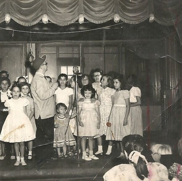 Um homem de boné, microfone à frente, corpo levemente inclinado em direção às crianças. Ao redor dele, meninas de vestidos rodados, laços no cabelo, meias brancas até a canela. Algumas olham para o apresentador, outras encaram a câmera com curiosidade contida. No canto inferior, parte do público acompanha sentado. A fotografia, da década de 1950, registra Pirajá, nome artístico de Aymoré Kley, à frente do programa Raia Miúda, no auditório da Rádio Londrina.
